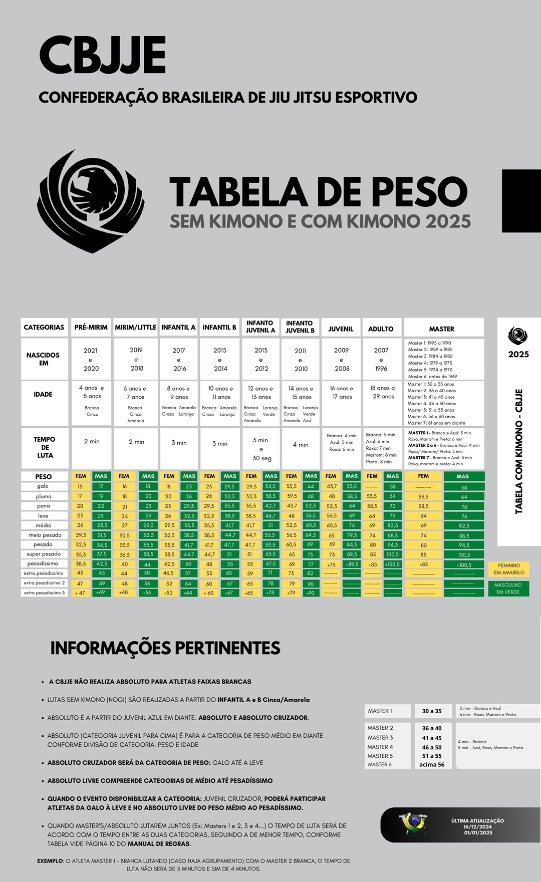 TABELA DE PESO => Informações e regras sobre as categorias e idades disponíveis para inscrição no evento, ou seja, quais os perfis de competidor poderão se inscrever.