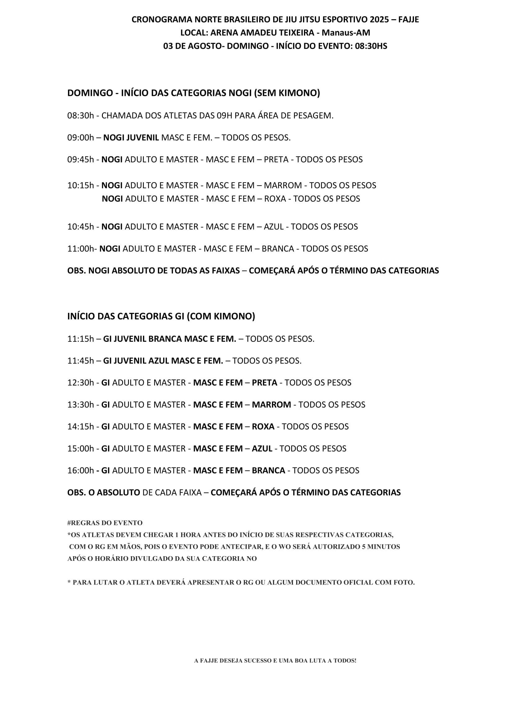 *Os atletas devem CHEGAR 1 HORA ANTES DO INÍCIO de suas respectivas categorias, com o RG em mãos, pois o evento pode antecipar, e o WO será autorizado 5 minutos após o horário divulgado da sua categoria no cronograma.