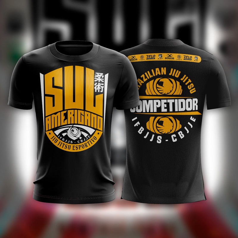 Rash guard com cor predominante da faixa que o atleta está disputando.